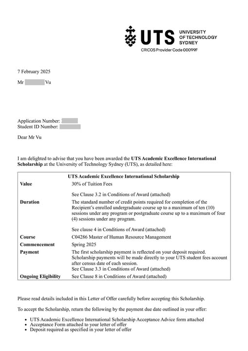 Chúc mừng bạn Vũ Nam đã nhận được học bổng 𝟯𝟬% từ Trường Đại học công nghệ Sydney (University of Technology Sydney).
