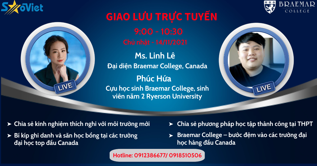 GIAO LƯU TRỰC TUYẾN VỚI CỰU DU HỌC SINH VÀ ĐẠI DIỆN TRƯỜNG BRAEMAR COLLEGE, CANADA VỀ BÍ KÍP HỌC TẬP THÀNH CÔNG, BƯỚC ĐỆM VÀ KINH NGHIỆM SĂN HỌC BỔNG TẠI CÁC TRƯỜNG ĐẠI HỌC TOP ĐẦU CANADA