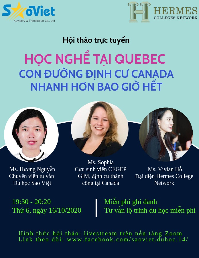 Nhằm tạo điều kiện cho Quý phụ huynh và các bạn sinh viên đang tìm hiểu ngành nghề và cơ hội định cư, Sao Việt Du học kết hợp với Hệ thống các trường Cao đẳng nghề ở Montreal, Quebec (Hermes Colleges Network) tổ chức Hội thảo trực tuyến: