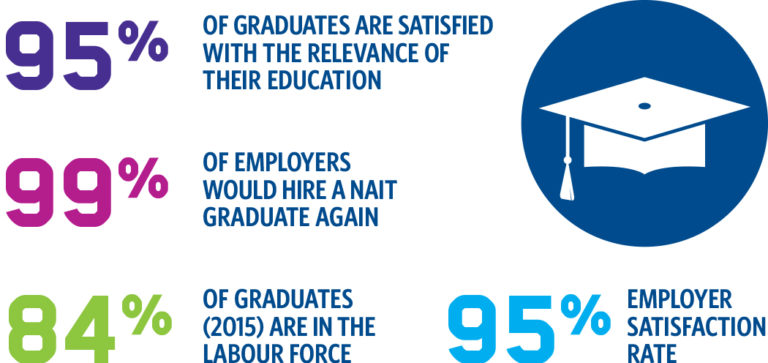 +NAIT luôn mang đến những con số ấn tượng, 99% sinh viên được thuê lao động dài hạn tại Canada sau khi tốt nghiệp, 95% sinh viên hài lòng về chất lượng đào tạo ở NAIT. NAIT còn mang đến một chất lượng giáo dục khác biệt khi giảng dạy 50% là lý thuyết và 50% là thực hành