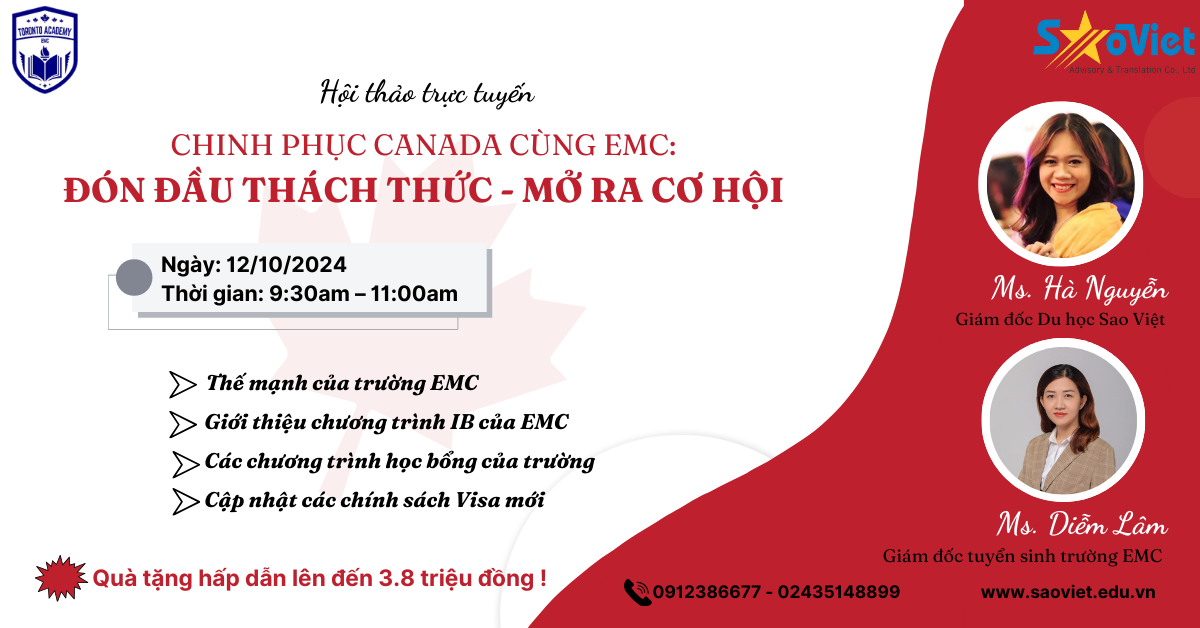 Tất cả những nội dung trên sẽ có trong buổi Hội thảo trực tuyến: “CHINH PHỤC CANADA CÙNG EMC: ĐÓN ĐẦU THÁCH THỨC – MỞ RA CƠ HỘI” do Du học Sao Việt đã kết hợp cùng với Trường Trung học Toronto Academy (EMC), Canada tổ chức.