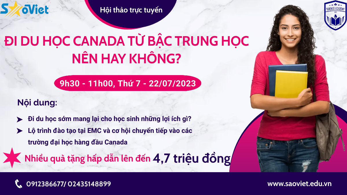 Để giúp quý phụ huynh cũng như các bạn học sinh có thêm thông tin để đưa ra quyết định có nên đi du học từ bậc phổ thông hay không, Sao Việt Du học kết hợp với trường Trung học Toronto Academy of English, Mathematics and Coding (EMC), Canada tổ chức Hội thảo trực tuyến với chủ đề: “ĐI DU HỌC CANADA TỪ BẬC TRUNG HỌC: NÊN HAY KHÔNG?”