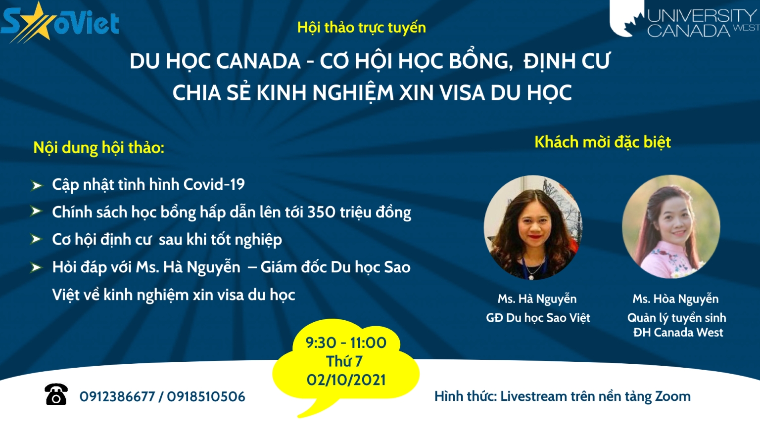 Đây có lẽ là những câu hỏi mà rất nhiều bạn học sinh – sinh viên cũng như các Quý phụ huynh còn băn khoăn khi đang có định hướng đi du học. Hiểu được điều này, Du học Sao Việt kết hợp với Trường Đại học Canada West tổ chức Hội thảo trực tuyến: DU HỌC CANADA - CƠ HỘI HỌC BỔNG, ĐỊNH CƯ - CHIA SẺ KINH NGHIỆM XIN VISA DU HỌC