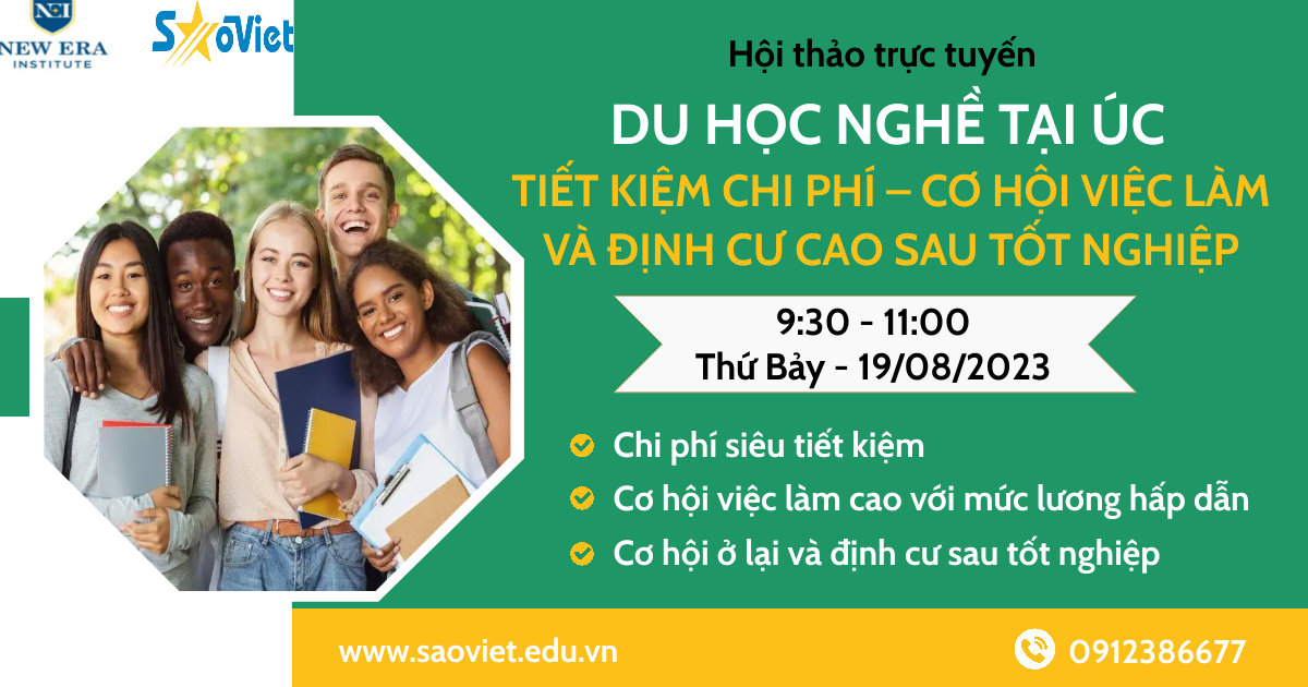 Để giúp quý phụ huynh và các bạn học sinh – sinh viên hiểu thêm về chương trình du học nghề tại Úc, từ đó có thêm sự lựa chọn phù hợp cho lộ trình du học của mình, Sao Việt Du học kết hợp với Học viện New Era tổ chức Hội thảo trực tuyến với chủ đề: "DU HỌC NGHỀ TẠI ÚC: TIẾT KIỆM CHI PHÍ – CƠ HỘI VIỆC LÀM VÀ ĐỊNH CƯ CAO SAU TỐT NGHIỆP"