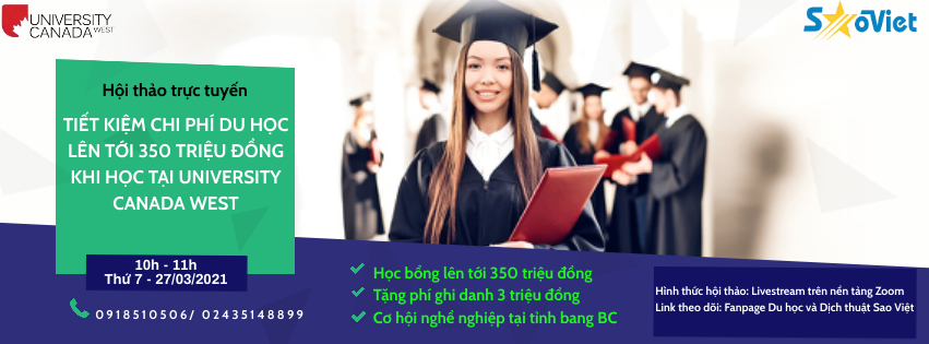 Để giúp Quý vị phụ huynh và các bạn có thêm thông tin về chương trình học bổng hấp dẫn này, Sao Việt đã kết hợp với Trường Đại học University Canada West tổ chức chương trình Hội thảo trực tuyến “TIẾT KIỆM CHI PHÍ DU HỌC LÊN TỚI 350 TRIỆU ĐỒNG KHI HỌC TẠI UNIVERSITY CANADA WEST”