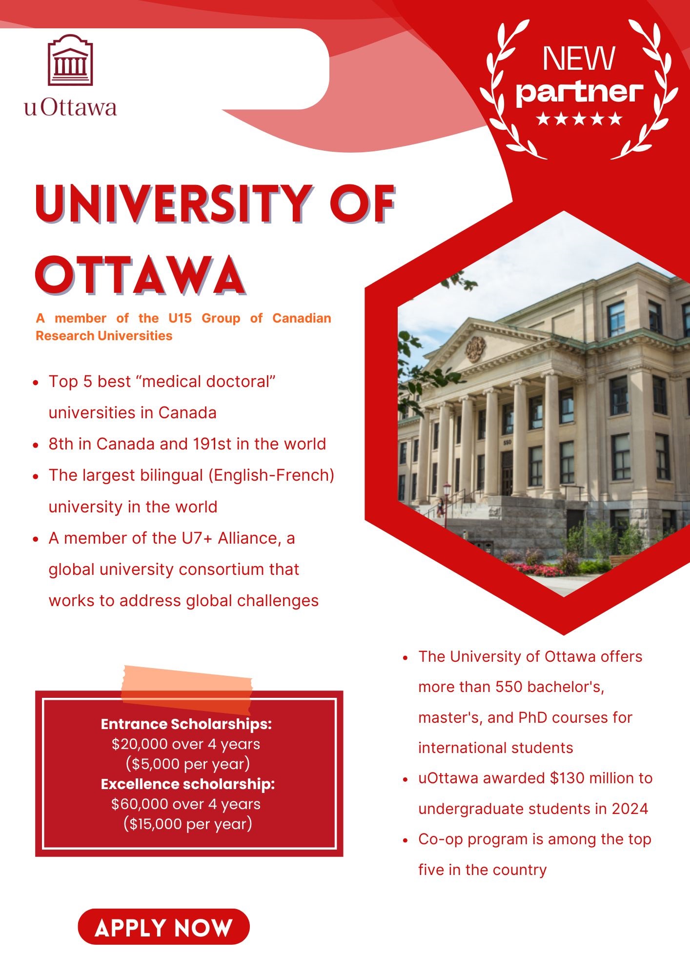 Đại học Ottawa, một thành viên của 𝗨𝟭𝟱 𝗚𝗿𝗼𝘂𝗽 𝗼𝗳 𝗖𝗮𝗻𝗮𝗱𝗶𝗮𝗻 𝗥𝗲𝘀𝗲𝗮𝗿𝗰𝗵 𝗨𝗻𝗶𝘃𝗲𝗿𝘀𝗶𝘁𝗶𝗲𝘀 (Nhóm U15 Các trường Đại học Nghiên cứu hàng đầu tại Canada), là một tổ chức hàng đầu cung cấp các cơ hội giáo dục và nghiên cứu đẳng cấp thế giới. Tọa lạc tại trung tâm thủ đô của Canada có thể dễ dàng tiếp cận các tổ chức lớn, Đại học Ottawa là trường đại học song ngữ (Anh-Pháp) lớn nhất thế giới.