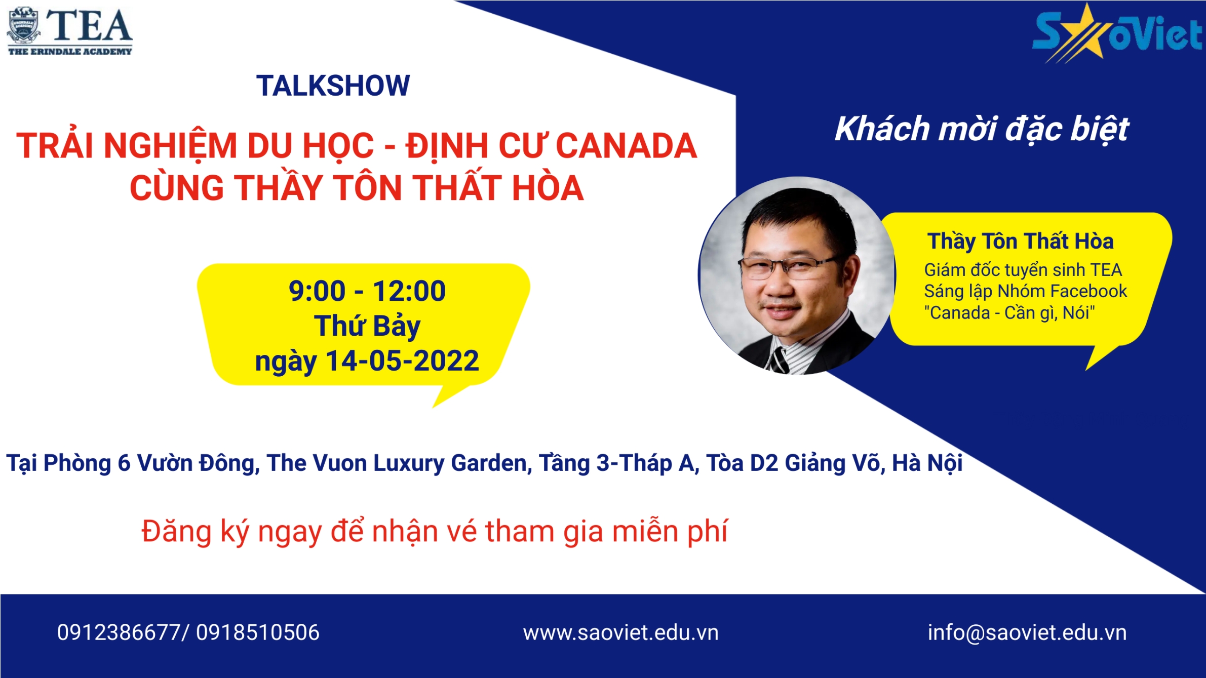 Kính mời Quý vị phụ huynh và các bạn học sinh – sinh viên tham dự Talkshow để cùng lắng nghe câu chuyện, những chia sẻ rất chân thực với cách nói chuyện giản dị, mộc mạc từ Thầy Tôn Thất Hòa - một điển hình thành công về con đường học tập – làm việc và trở thành thường trú nhân tại Canada.