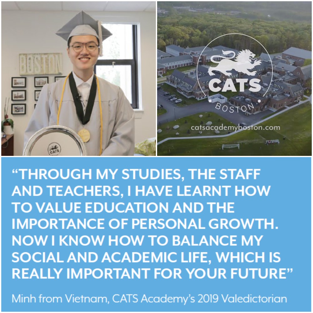 Thật tự hào khi vừa qua trường CATS Academy Boston có 1 Thủ khoa năm 2019 là học sinh Việt Nam - bạn Trần Tuấn Minh. Đây là năm thứ 4 liên tiếp học sinh Việt Nam xuất sắc dẫn đầu ngôi trường có hơn 500 học sinh đang theo học này: Phan Tài Anh Hào (Thủ khoa năm 2016), Bùi Quang Huân và Phan Ánh Dương (đồng Thủ khoa năm 2017), Nguyễn Trúc Anh (Thủ khoa năm 2018) và Trần Tuấn Minh (Thủ khoa năm 2019). Có thể nói trường CATS Academy Boston rất phù hợp với học sinh Việt Nam khi có "khuôn" Thủ khoa là học sinh Việt Nam trong suốt 4 năm vừa qua 2016-2019.