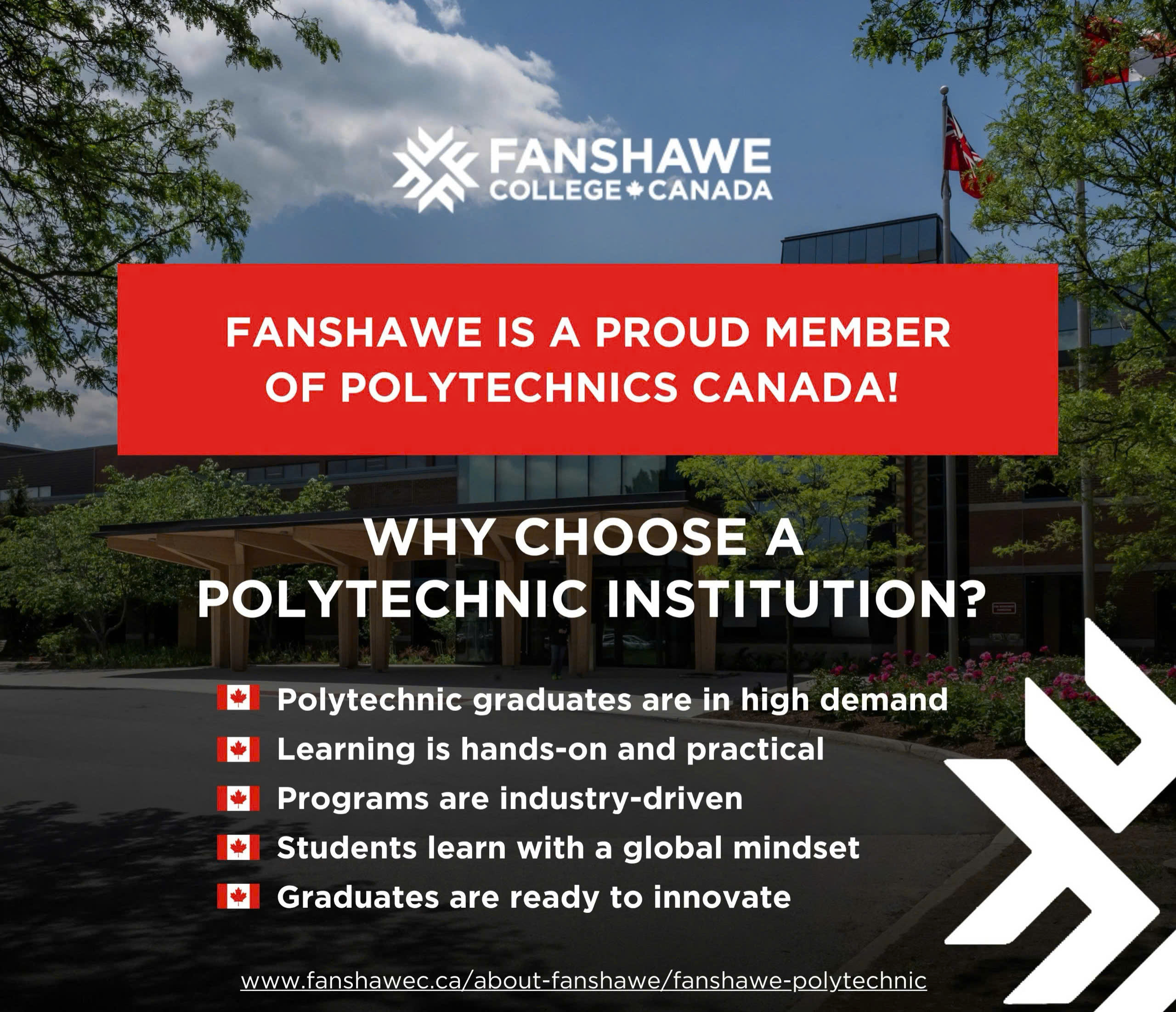 Cung cấp các chứng chỉ giáo dục tiên tiến, bao gồm bằng cử nhân, bằng cao đẳng và chứng chỉ, trường Bách khoa Fanshawe là sự lựa chọn lý tưởng cho mô hình đào tạo thực tiễn kết hợp thực hành và các chương trình thực tập thực tế tại các tập đoàn quốc tế tại Canada. Đồng thời, trường Bách Khoa Fanshawe củng cố sứ mệnh của Hiệp hội Bách khoa Canada trong việc vận động chính sách, bởi vì đây là một tổ chức đổi mới và chuyển đổi.